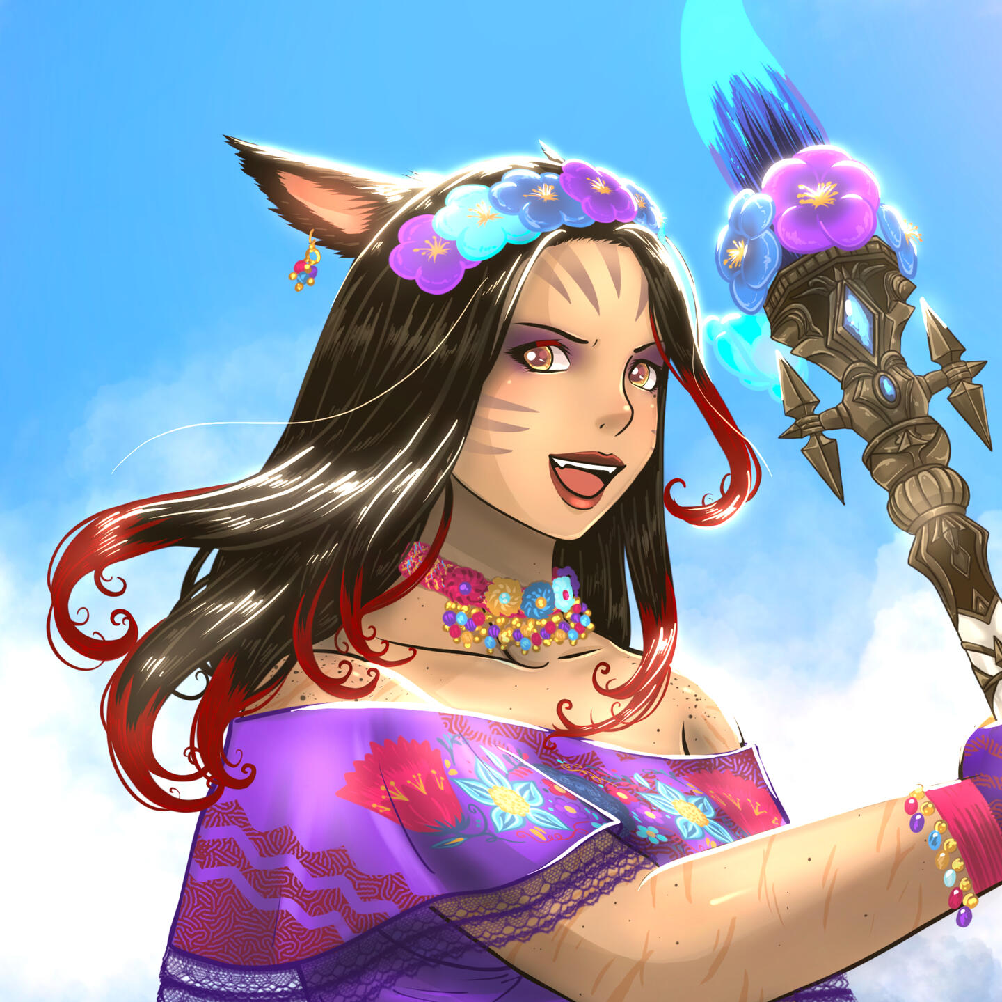 -Distinguishing Features: beauty mark on her left cheek bone, Miqo’te markings on her forehead and cheeks, scars scattered over her armsPersonality